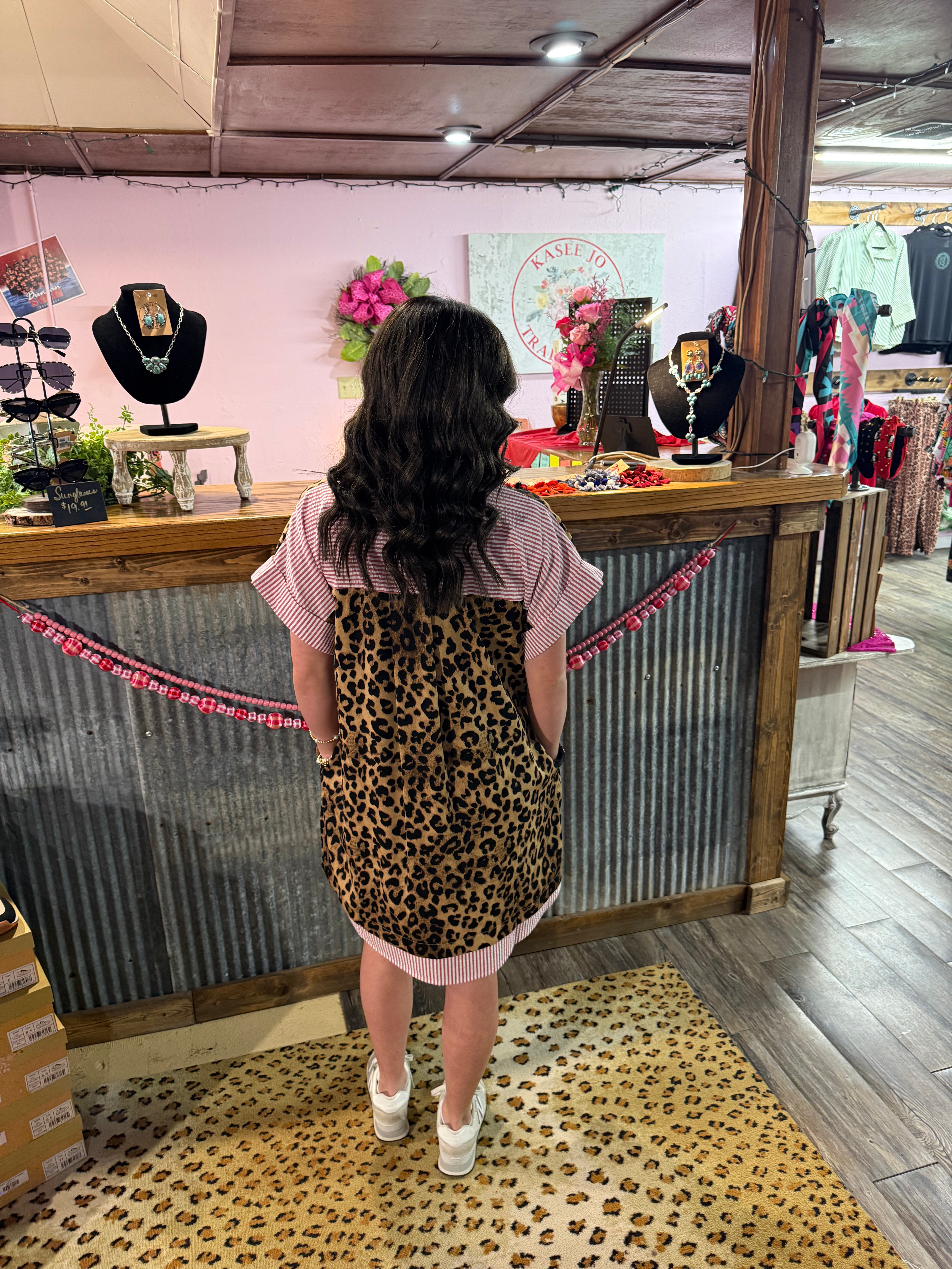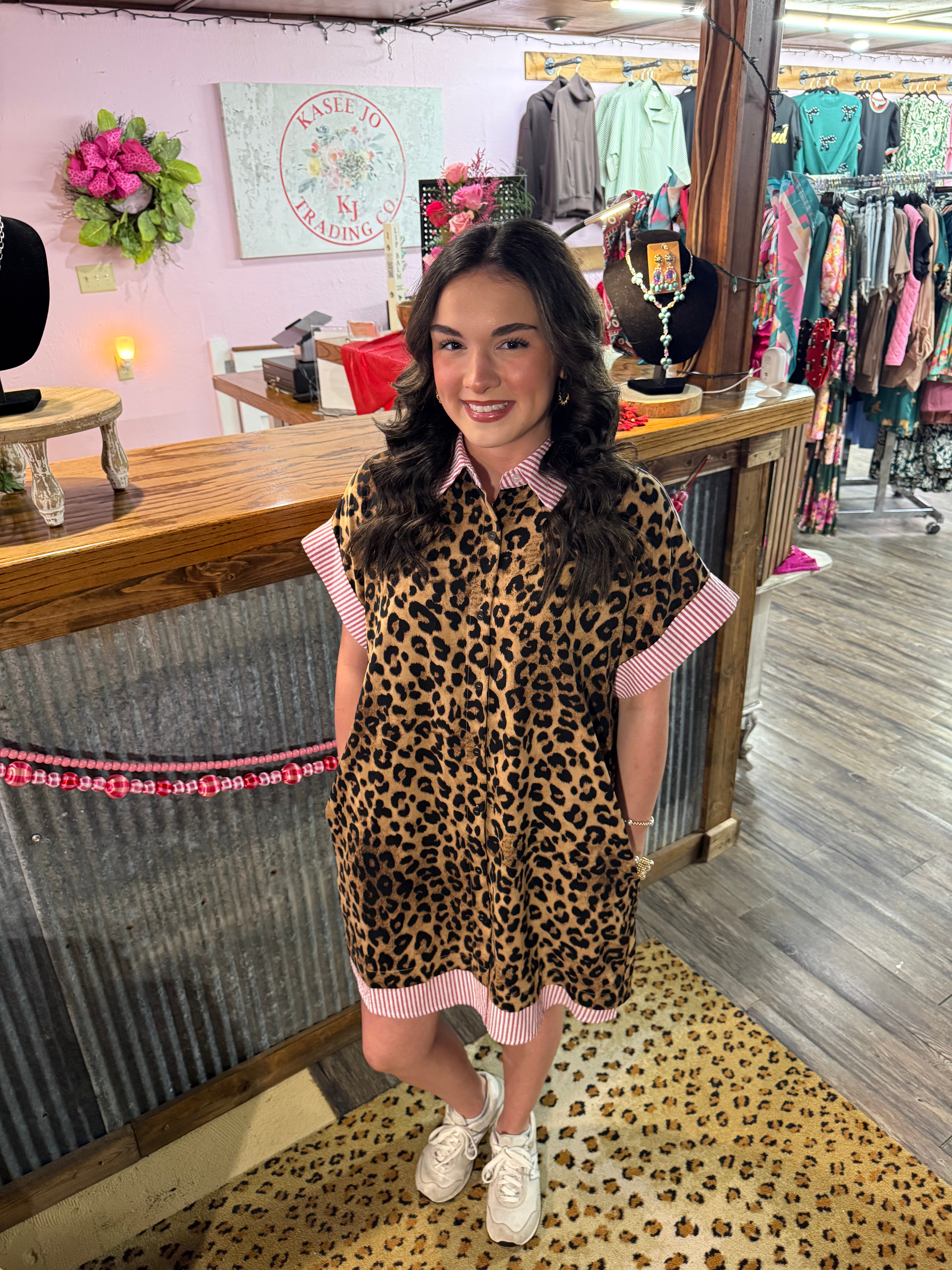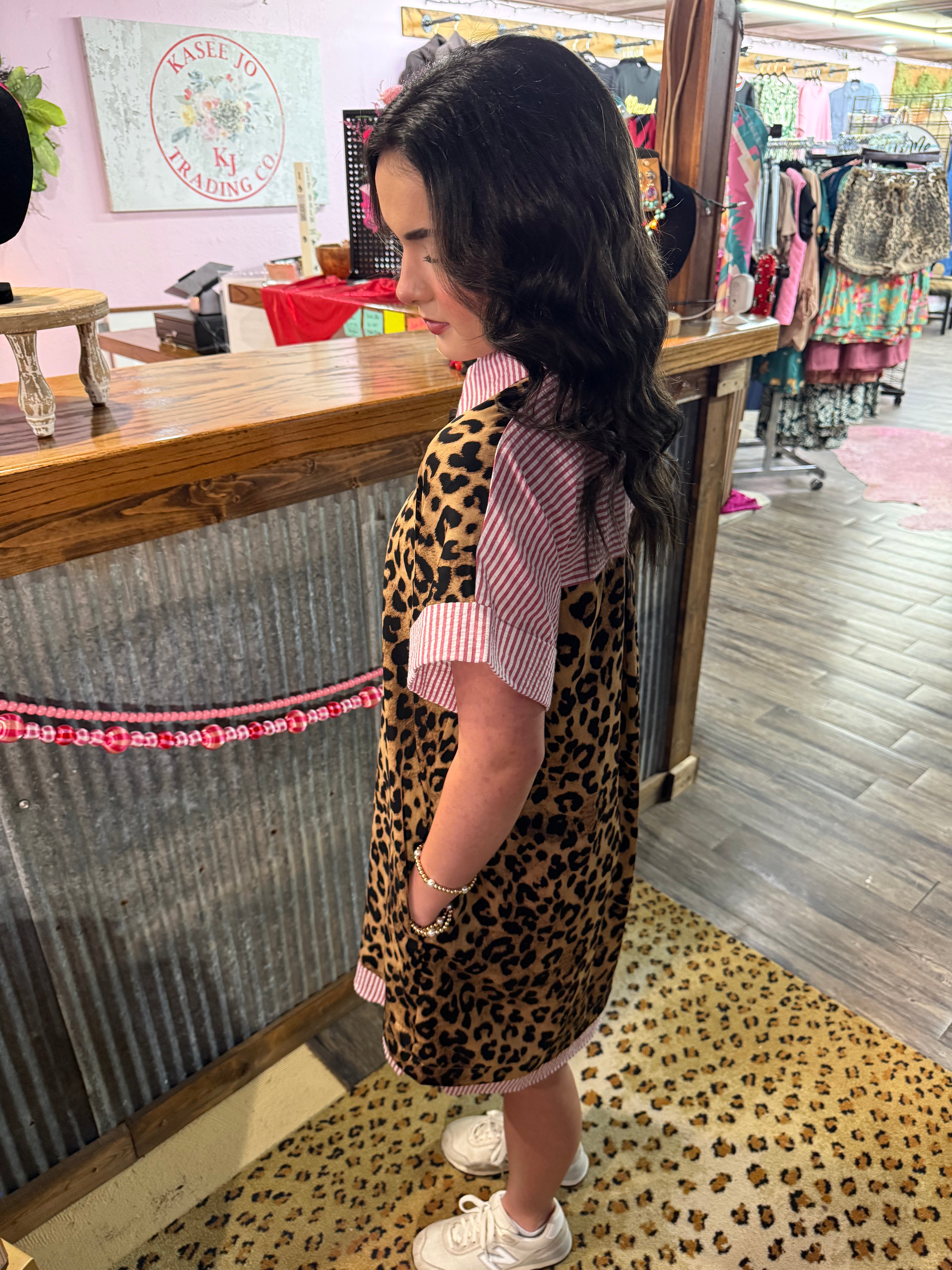 Leopard Shirt Dress with Red Stripes - S is backordered and will ship as soon as it is back in stock.
