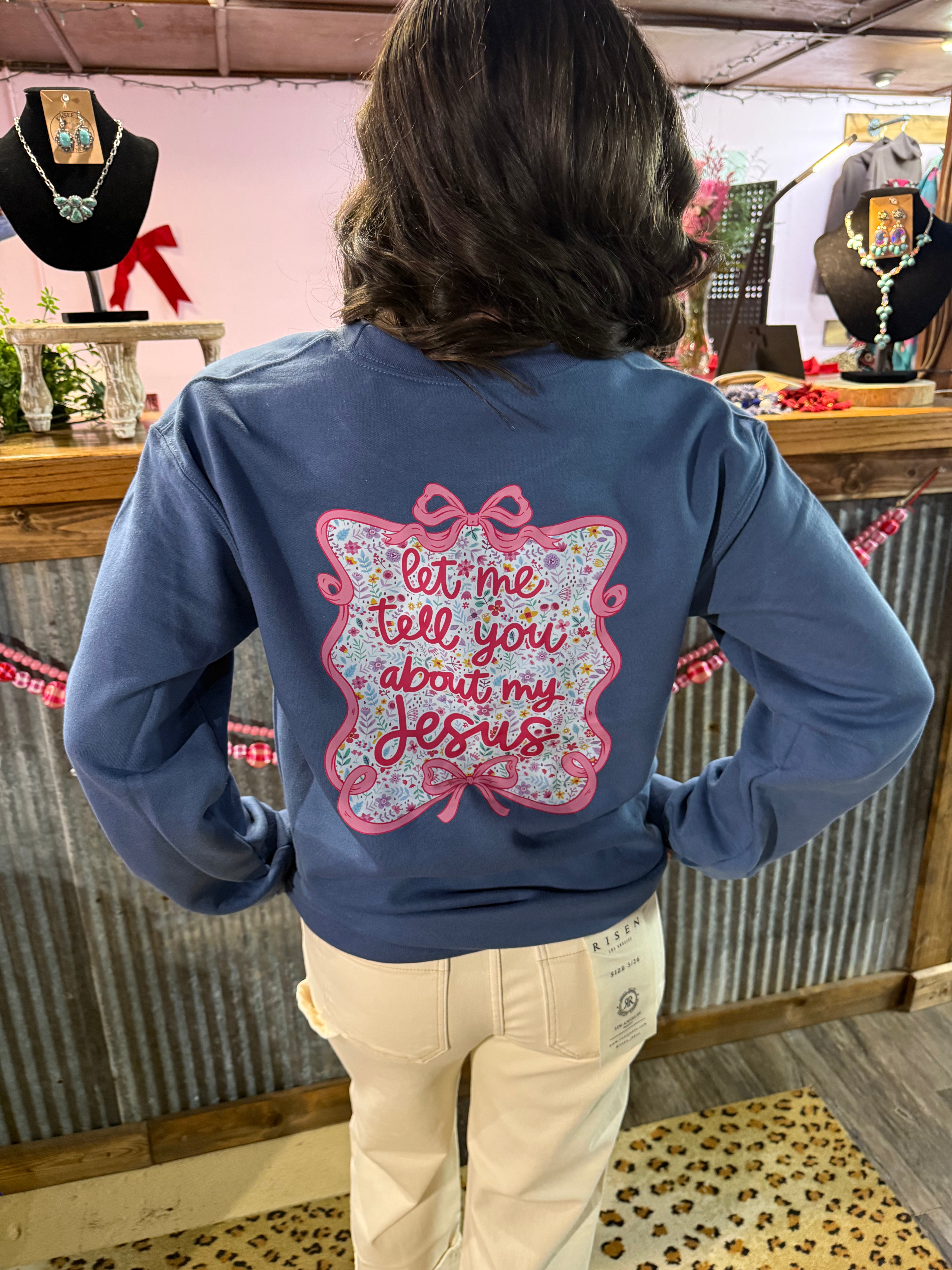 Let Me Tell You About My Jesus Sweatshirt - S is backordered and will ship as soon as it is back in stock.
