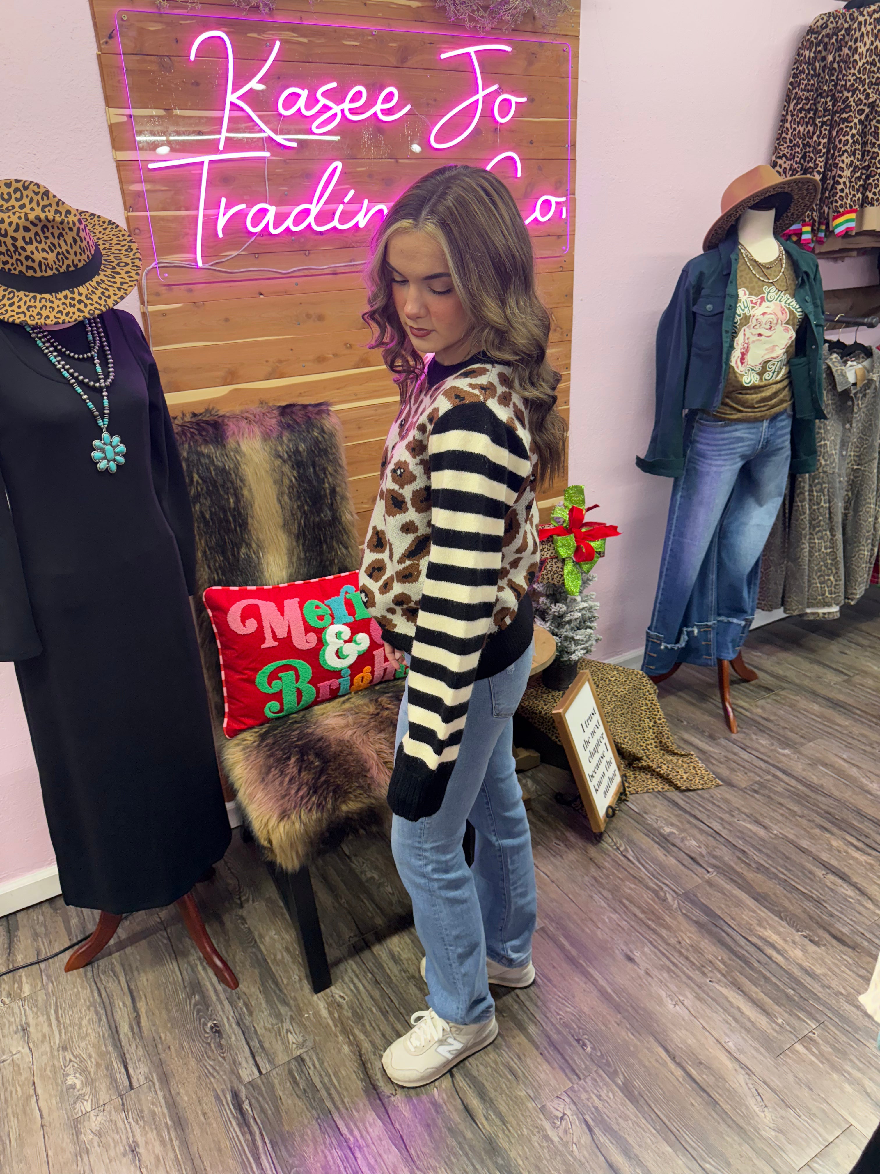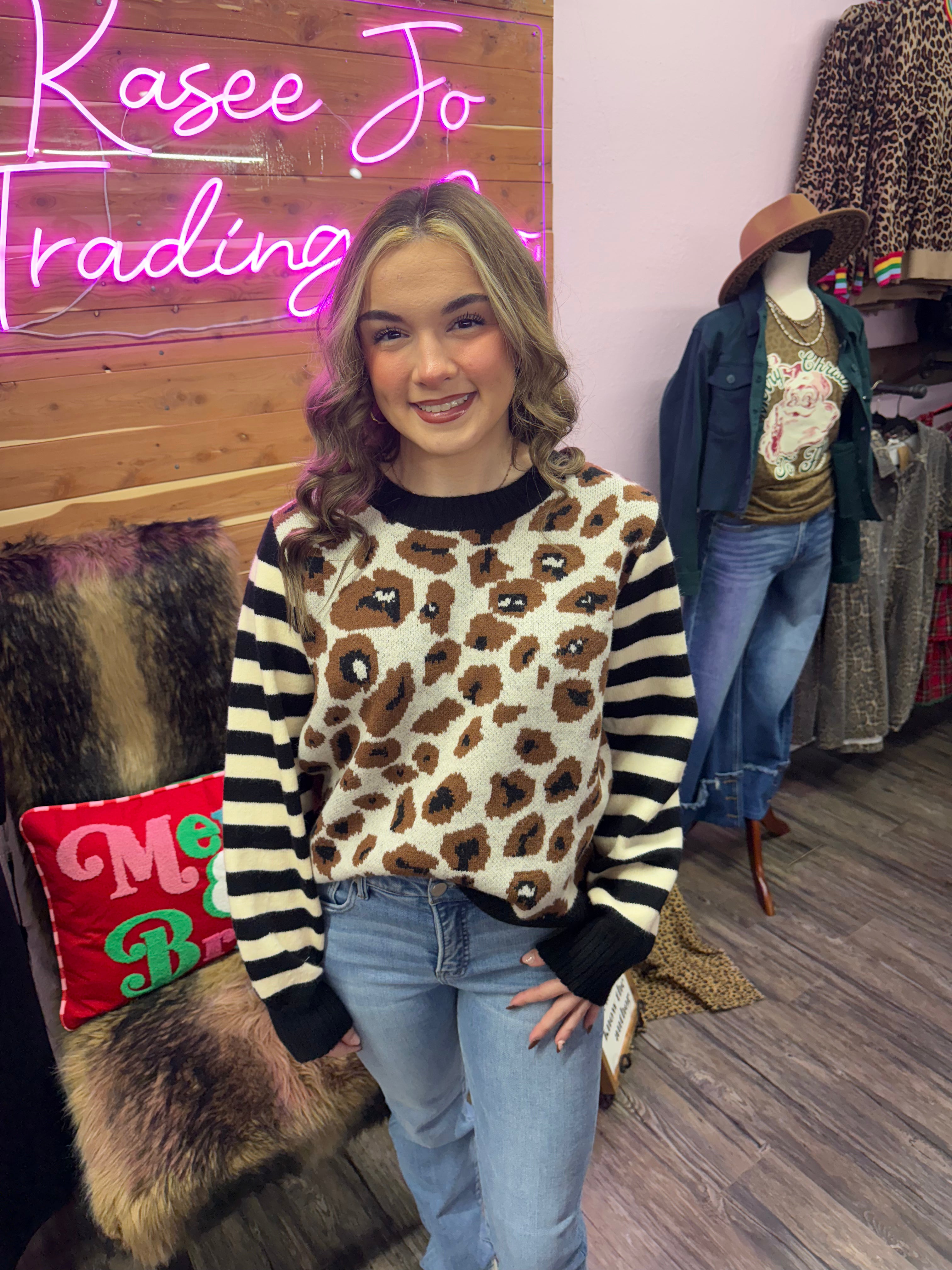 Neutral Leopard with Stripe Sleeve Sweater - S is backordered and will ship as soon as it is back in stock.